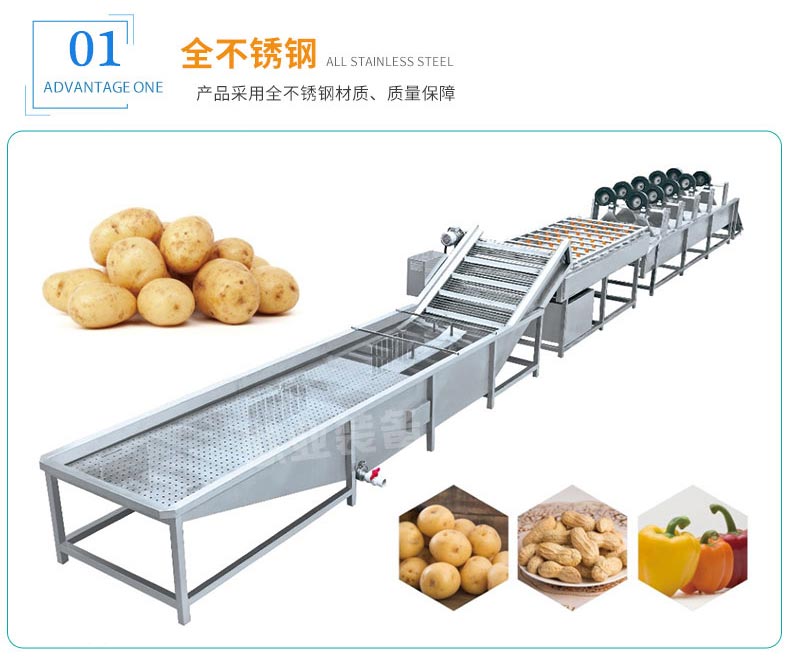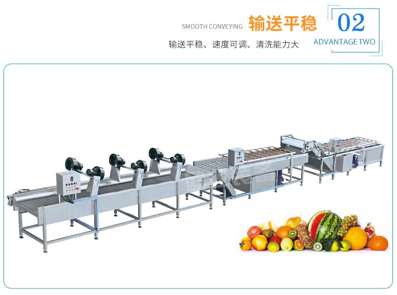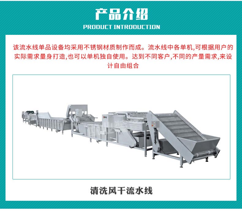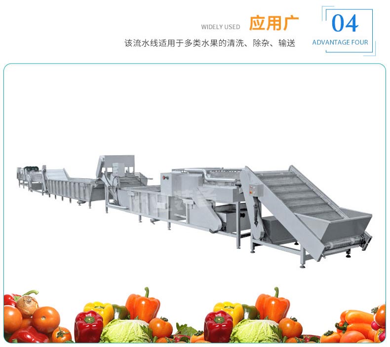 流水線采用食品級材料安全可靠、無污染。輸送平穩,速度可調,將前道整理去雜等工序切割完畢的蔬菜通過強力鼓泡、水流沖浪、翻轉、高壓噴淋等清洗方式,從而使蔬菜更潔凈,更清脆,并延長蔬菜的儲存時間。將帶有水的蔬菜震動風干脫水后再做即可自動裝筐、稱重、包裝入庫。  該流水線適用于:蔬菜、水產品等顆粒狀、葉狀、根莖類產品的清洗等。
